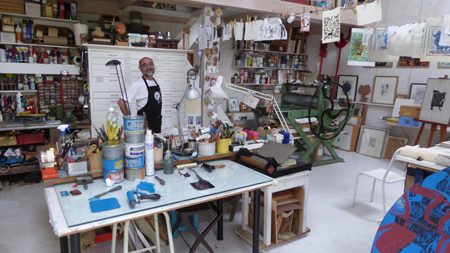 Pour la première fois, Alain Cazalis a inscrit l’ouverture de son atelier de Saint-Martin de Ré à la 5° Fête de l’estampe. Il fallait donc s’y rendre. Portail franchi, une cour typiquement rétaise et pavée accueille les visiteurs avec ses fleurs, sa treille de vigne, son bosquet de bambou bruissant, ses carrousels d’images imprimées disposés ici et là, et, curieux véhicules de sorcière, divers balais peints tout en rouge. L’estampe est ici à l’honneur. Elle l’est aussi mais d’une autre manière dans son atelier parisien dont on trouvera la description sous la plume de Maxime Préaud dans les « Nouvelles de l’estampe » de juillet 2017.