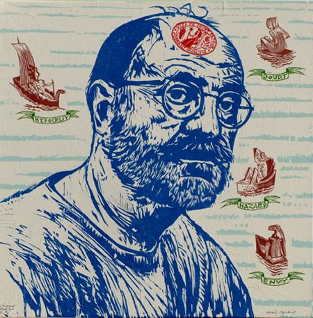 En regardant de très près les deux œuvres de Jacques Callot, on peut détailler sur le panorama des planches, à côté et entre les vaisseaux de ligne, une multitude de minuscules embarcations, barques, canotes, chaloupes, doris, etc. qui affrontent dans tous les sens les flots, les boulets de canon et les balles des mousquets. Toutes flottilles barrées ou ramées par des équipages tout aussi minuscules. Or, depuis quelques années, Alain Cazalis peuple ses planches gravées d’étranges et incongrus esquifs à la flottabilité totalement improbable, sortes de caisses à savon des mers, frêles et fragiles, qui sont manœuvrés, à la va que le vent te pousse, par d’imaginaires personnages masculins et féminins. Tous ces équipages solitaires tentent avec courage et obstination, isolés sur leurs dérisoires embarcations, d’atteindre les rivages de portulans où ne figure aucun havre de paix, comme on peut le voir sur son autoportrait tamponné reproduit ici.