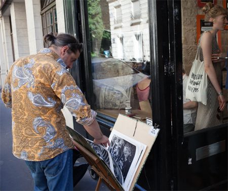 Toujours pédagogue, il explique le pourquoi et le comment. À partir de deux de ses dessins, à l’encre de Chine et à la plume d’acier, il a fait graver par découpe au laser du médium afin d’obtenir l’exactitude vibrante de la plume sur le papier. En revanche, il a gravé manuellement à la gouge les deux planches couleur de ses deux dessins. Ces explications transmises, il invite les visiteurs au tirage d’un taureau tatoué.