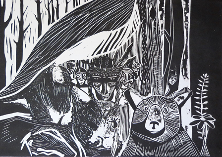 L’inventivité d’Alain Cazalis ne se limite pas à ces manipulations créatives. « Il faut bien s’amuser », dit-il très sérieusement. Au programme de ce jour de fête est inscrite la poursuite de sa série d’animaux fantastiques en taille d’épargne xylographiée : « Taureau tatoué » et « Face de bouc », dont une douzaine de tirages sèchent encore sur le filin.