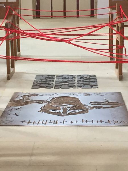 Je n’ai peut-être pas suivi l’ordre exact de l’installation, j’ai été attirée de suite par l’impasse de la guerre, un long fil rouge épais entrecroisé sur les chaises de l’église dans l’allée centrale de la nef. Fil rouge, comme une histoire à dérouler ou à se remémorer, comme tout ce sang qui noyait alors nos terres picardes. Au sol, les neuf carrés de linogravure, portrait éclaté de Guillaume Apollinaire ainsi qu’un grand carré en linogravure, une gueule cassée creusée jusqu’à la trame. Creuser, creuser des tranchées, ils n’ont fait que cela les poilus, comme pris au piège de cette guerre de tranchées, ils n’étaient pas mobiles.