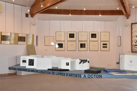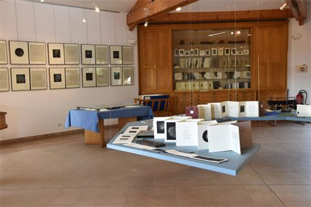 Je savais que Christine travaillait depuis deux ans sur l’installation de Saint-Mard et j’avais eu la chance de voir en primeur le livre « Du coton dans les oreilles », extrait de « Obus couleur de lune » – Calligrammes de Guillaume Apollinaire, lorsque nous avions exposé ensemble à la Galerie associative de Beauvais lors de la Fête de l’Estampe 2017. Ce beau livre comprend quatre linogravures, un contretype, un monotype, un gaufrage, il est typographié et relié par Christine, et enfin, recouvert d’un drap de laine bleu horizon.