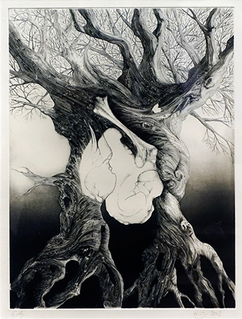 Pour André Bongibault, qui s’adonne aussi à l’œuvre peinte, la gravure est une véritable symphonie picturale, où aquatinte, manière noire et burin sont les révélateurs d’une énergie visuelle et mentale exceptionnelle, reflétant une pensée profonde, empreinte de philosophie orientale. Pour Hélène Damville, marquée par la pratique du dessin et de la peinture dans les laboratoires d’anatomie comparée du Muséum d’Histoire naturelle de Paris, la gravure est l’expression rebelle de visions fortes, peut-être en blessures qu’elle sculpte avec vigueur dans le bois, le lino ou le métal, pour exprimer, – après des visions végétales torturées -, gueules cassées et danses macabres. Quant à Carole Texier, chantre de la taille directe sur lino et métal, elle évoque sur la teinte claire du papier japon, ici en traits d’encre au noir intense, là en lignes fines enserrant des teintes légères, des silhouettes désincarnées de Humains ou Signica, mais évocatrices, dans des postures figées ou en mouvement, d’une pensée complexe et d’une grande richesse ouverte à l’interprétation de chacun.