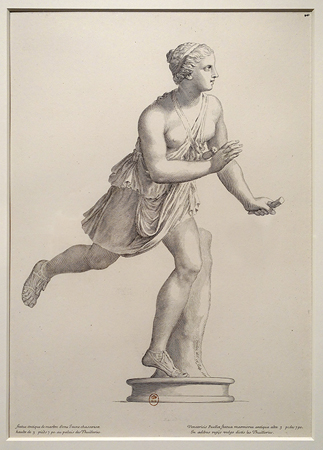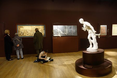 Dans une relative pénombre et l’éclairage discret des œuvres en cimaise, on se retrouve dans un lieu où Baudelaire aurait ressenti le luxe des cuivres aciérés en brillance de réflexion, le calme dû aux visiteurs, inquisiteurs silencieux des tailles, et volupté de vivre des instants rares, de par la qualité de ce qui est présenté, de la beauté de gravure. Dans la première salle, une jeune fille, assise à même le sol, croque un superbe marbre antique du IIe siècle, intitulé « Atalante Mazarin », que Claude Mellan a transcrit au burin en 1671, sous le titre « Statue en marbre d’une jeune chasseresse ».