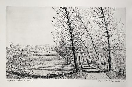 Il n’a pas été simple à la dynamique animatrice de la galerie, Nathalie Soulier, et à Marie Jacquemin, la belle-fille de l’académicien, qui continue de diffuser l’œuvre gravé de son beau-père, de choisir, dans ce vaste fond de près de deux mille pièces, les estampes les plus significatives du graveur. Des paysages et des portraits constituent la majeure part de celles accrochées ici. Il faut prendre le temps d’aller d’un pas tranquille au travers des quatre salles pour admirer à loisir les estampes de ce maître du paysage. Tous les siens, et particulièrement ceux de l’entre-deux guerres, magnifient le lent travail du paysan qui les a façonnés, avec ces champs, prés, labours, haies, clôtures, piquets, tous parcourus par ces chemins vicinaux bordés d’arbres qui mènent à un village et son clocher lovés dans le repli d’une colline derrière les ondulations d’un champ d’orge.