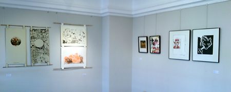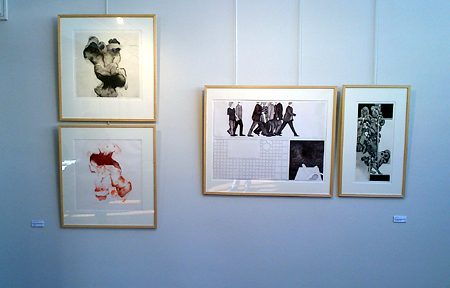 Après une longue visite, voici seulement glanés quelques diptyques qui n’ôtent rien à tous les autres. Le commissaire, Éric Fourmestraux, qui s’est plié à sa propre contrainte, et son alter-ego, Isabelle Mehling-Sinclair, ont su graphiquement se fondre dans un propos sibyllin qui, s’il crève les yeux, n’en reste pas pour le moins très énigmatique ou tristement tragique. Raúl Villullas et Ivan Sigg ont si bien emprunté l’un à l’autre leurs rudes noirs soulignés d’un geste multicolore que l’on ne sait plus qui est l’un ou l’autre. Jeanne Rebillaud et Sandra Redinger ont magistralement mis leur virtuosité technique au service d’un hommage réciproque où ne se laissent plus deviner ni le dessiné ni le gravé. En minuscules et en majuscules, les signes graphiques de Catho Hensmans et Christine Gendre-Bergère dialoguent en contrepoint sur le mal-être contemporain. D’autres surgissent devant les yeux malgré leur appariement : les pierres noires de Sophie Baduel, une tête d’Anne Loubry, les épidermes de Thomas Bouquet, les striures de Gloria Alonso ou le pain d’épices de Didier Hamey.