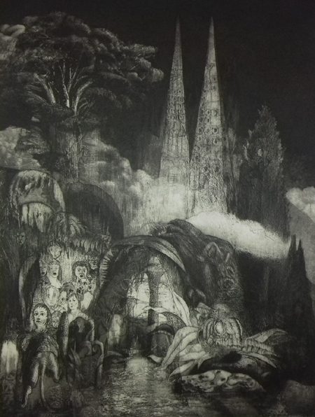 Les mondes enchantés dans lesquels les eaux-fortes savamment travaillées de Francis Capdeboscq nous entraînent brouillent tous nos repères. Commençons le voyage : à l’Embarcadère nimbé d’une lumière blanche qui rend les noirs de l’aquatinte encore plus profonds, et presque inquiétants, tout semble d’un calme magnifique. De sorte qu’une fois parvenu à la Lisière d’une forêt qui pleure, lavée de toute présence humaine à l’exception d’un couple sortant d’un arbre et d’un château fondu dans les nuages, on s’attend presque à voir surgir à l’aube de ce premier jour le lièvre de Rimbaud qui, « aussitôt que l’idée de Déluge se fut rassise… dit sa prière à l’arc-en-ciel… ».