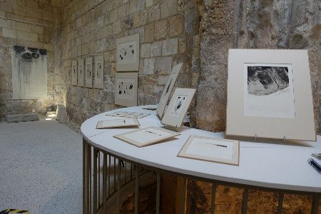La Rochelle, le 24 septembre 2020, vernissage dans un écrin chargé d’histoire. Un vernissage dans un écrin de pierre calcaire charentaise de blanc antique coloré, la Tour St Barthélémy qui jouxte la cathédrale de La Rochelle. Une osmose réussie : de sobres encadrements des œuvres (estampes et dessins), sans vitre de protection, offrent ainsi au regard une connivence avec les subtilités infinies des estampes proposées par Catherine Gillet.