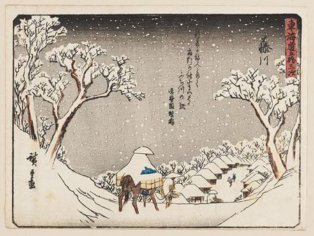 Pour en prendre un seul exemple parmi les cinquante-six, décrivons la trente-huitième étape, Fujiwara, celle d’un paysage enneigé avec ses arbres pétrifiés par leur gangue de neige où la route indistincte s’enfonce dans un talweg et descend vers un village emmitouflé de blanc, sur cette piste effacée trois personnages cheminent sous les flocons, un piéton à mi-corps dans la pente, un palefrenier et son cavalier lourdement chargé. Une estampe qui n’est pas sans rappeler  le tableau , « Chasseurs dans la neige », de Pieter Brueghel l’ancien.