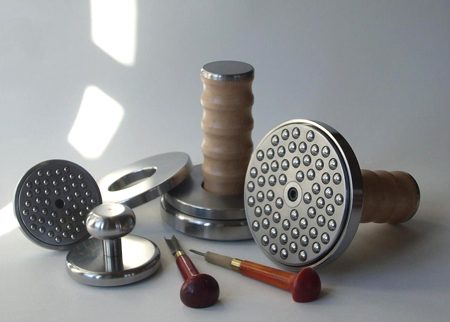 Le principe est de présenter une surface pressante formée de billes d’acier rotatives, ce qui en fait un outil unique et performant pour assurer une pression régulière et forte du papier sur la matrice. Il en existe trois versions. Une petite, de diamètre 75 mm et comportant 50 billes de diamètre 6 mm ; une grande, de diamètre 118 mm, et comportant 60 billes de 10 mm, pour la version taille d’épargne, et, pour la version taille-douce, 150 billes de 6 mm, . La petite pèse 550 g et la grande, selon de modèle, de 1,570 à 1,520 kg, s’y ajoutant la possibilité d’accroitre le poids avec des rondelles d’acier de 600 g. Donc un instrument de pressage à la fois simple et sophistiqué dans sa conception, et propre à répondre à toute demande.