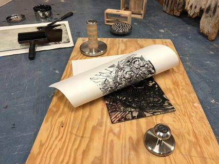 Pour ce faire, on peut utiliser d’une manière manuelle la cuillère, un frotton (ou le baren japonais ou californien) pour imprimer une planche encrée. Tereza Lochmann utilise pour ses créations, essentiellement de taille d’épargne, un outil qu’elle a découvert en 2016 lors d’un colloque de linogravure organisé dans son pays par le musée municipal de Klatovy-Klenová, un outil plus élaboré que le baren traditionnel, et fabriqué par un artiste tchèque, Miloš Sláma. C’est la Sláma Press, qu’elle utilise depuis systématiquement et dont elle ne peut plus se passer. Cette presse à main, qui peut imprimer des papiers d’épaisseurs différentes (ce que ne fait pas le baren asiatique, dédié aux papiers fins, Japon ou Chine), parfaitement adaptée à la taille d’épargne, serait, au travers de l’une de ses versions, utilisable aussi en taille-douce.