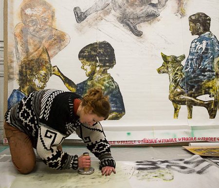 Dans des évocations picturales en quête d’intemporalité, souvent en transgression, là où enfance et adolescence sont en quête de devenir et en perte d’innocence, là aussi où l’être vivant oscille entre humanité et animalité, l’image peut avoir sa propre indépendance, mais aussi se révéler dans la recherche spatiale de l’installation, qui va ajouter son intensité à la perception. Elle est peintre, usant de l’acrylique, du marqueur ou du stylo bille, d’encres litho, de pigments qu’elle va porter sur des supports divers, papiers, toiles,… mais elle utilise aussi la gravure, celle du bois, surtout, et aussi du lino, pour créer des éléments-estampe non dédiés au multiple, mais qui vont générer la création picturale ou s’y inscrire lui donner sens ou l’enrichir…