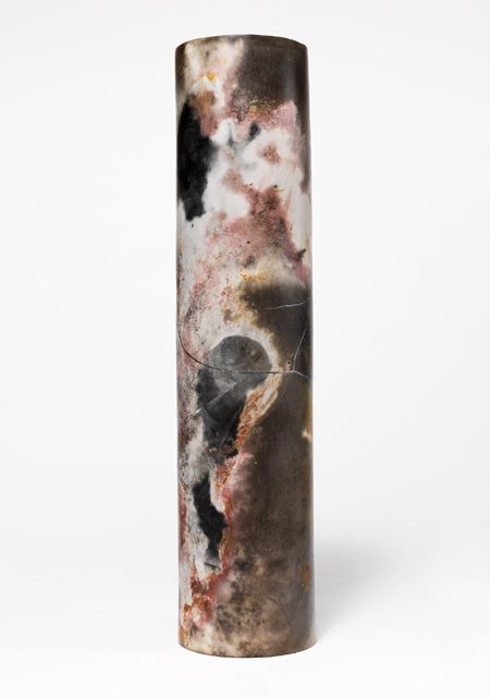 On se plonge avec délices dans les détails graphiques que le feu a créés sur les céramiques, noir de fumée et rouges oxydés se répondent dans une chorégraphie qui semble venir du fond des âges. Certains rouleaux de céramique, fendus par l’intensité du feu à la cuisson, sont retravaillés (grâce à l’intervention de Myriam Greff) suivant la technique japonaise Tintsugi, art de recoller les morceaux avec de la laque et du métal fondu, ici de l’étain, parce que se briser ce n’est pas disparaître mais se patiner, s’embellir de l’expérience d’une vie. Ces pièces côtoient d’autres céramiques d’une modernité absolue, réalisées dans une terre travaillée presque comme une porcelaine charnue, douce, sensuelle, mettant à nu les formes étranges que révèlerait la modélisation d’un enregistrement de la chaleur sous la surface de la Terre.