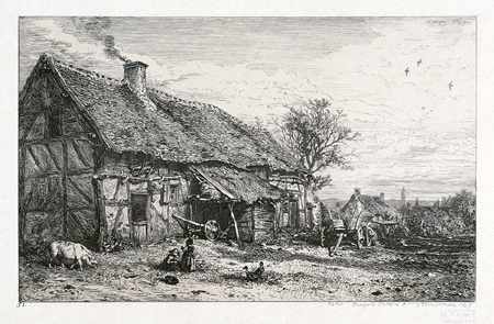 Auteur des deux eaux-fortes présentées ici, la “Chaumière de paysans” (état 2) et “Le Labourage”, le graveur Charles Émile Jacque (1813-1894), (qui habita Grande rue au n°24), fut, après une période de gravure d’interprétation d’après les maîtres hollandais, un véritable artisan de la gravure originale, s’inspirant de cet environnement rural et s’attachant à décrire la vie agricole locale et ses acteurs, cela sur près de 600 gravures. Des évocations réalistes pleines de sensibilité. Il fut l’un des éléments de ce foyer d’artistes créateurs, qui «se voulaient portraitistes de la nature avant d’être les chantres de la campagne»*. *(Dictionnaire de la Peinture, École de Barbizon, Larousse). Il en reste aujourd’hui un témoignage global, gravé ou peint, d’une force incontestable.