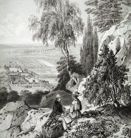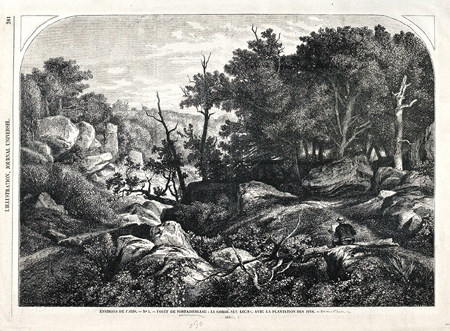 Et les artistes de partir à la découverte du décors somptueux de la forêt, comme ce peintre solitaire représenté par Auguste Anastasi (1820-1839), et que l’on voit installé avec son chevalet sur un rocher en bas à droite de la gravure.
