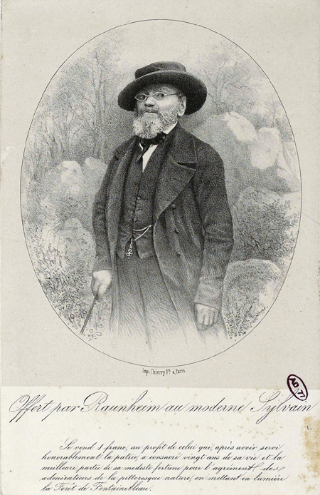 Et là, une autre parenthèse s’impose, car un personnage avait pris conscience de l’intérêt de la forêt en tant que site touristique. Pourtant, rien ne le prédisposait à s’y intéresser. Il s’agit de Claude-François Denecourt (1788-1875). Ancien militaire de l’armée napoléonienne, dans laquelle il s’était engagé en 1809, il fut nommé concierge d’une caserne de Fontainebleau, en 1832, avant d’être révoqué en raison de ses pensées républicaines.