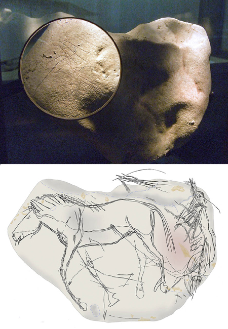 On est loin, bien sûr, de la gravure telle que nous la connaissons dans son esprit ou la pratiquons. Par contre, il est intéressant d’évoquer une pierre gravée qui a été trouvée dans le site magdalénien d’Étiolles, dans l’Essonne. Elle est figurative et procède d’un art consommé de l’art préhistorique. Il s’agit là d’un témoignage rarissime de l’art paléolithique en Île-de-France, datant d’environ 13 000 ans ! On est confondu par la perfection et la justesse de la représentation chevaline.