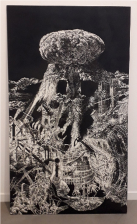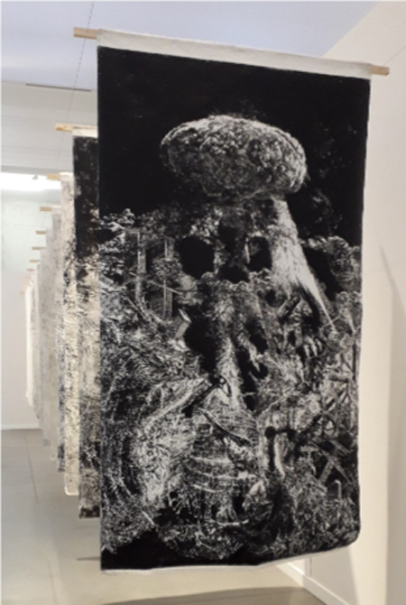 Camille Dufour (née à Mons en 1991) présente une grande estampe gravée en bois en 2019, mesurant 2100 x 1220 mm, intitulée Lavandière de nuit ♯ 1. Le sujet est un montage de scènes quelque peu rudes entre la destruction de la tour de Babel et l’attentat sur les Twin Towers, le tout surmonté d’un champignon atomique qui coiffe l’apparence d’un crâne humain. L’estampe est accompagnée de la planche de bois, ainsi que de toute une série d’épreuves qui en sont tirées successivement après la première, perdant de leur teinte au fur et à mesure que, pour justifier le titre de l’œuvre, l’artiste en frottait le verso avec un bloc de savon d’Alep qui faisait office de baren. (NB Alep, on fait fort dans le symbole et le concept, chez ces jeunes gens.)