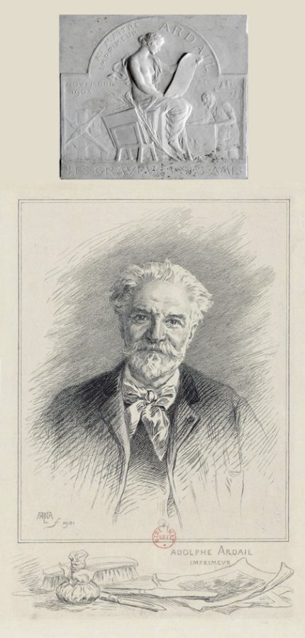 Quant à Ardail, il devint un personnage charismatique, apprécié pour son goût de la belle épreuve et son habileté d’imprimeur : il excellait notamment dans l’art du retroussage, peu pratiqué alors, qui exprime des noirs « moelleux ». Son aura fut grande : « Être imprimé par Ardail, ou ne pas l’être du tout », disaient les artistes à cette époque, ainsi que le rapporte le collectionneur et écrivain d’art Henri Beraldi (1849-1931) dans Les graveurs du XIXe siècle, guide de l’amateur d’estampes modernes (1892). Et nombreux furent les artistes qui lui offrirent des gravures en remerciement. Lors d’un banquet offert par la Société des Aquafortistes français, le 19 mars 1904, un bronze réalisé en 1903 par Louis-Alexandre Bottée (1852-1940) fut remis à Adolphe Ardail pour le remercier de son engagement dans l’art de la gravure. L’œuvre est conservée au Musée d’Orsay, mais le moulage en plâtre se trouve au Château-Musée.