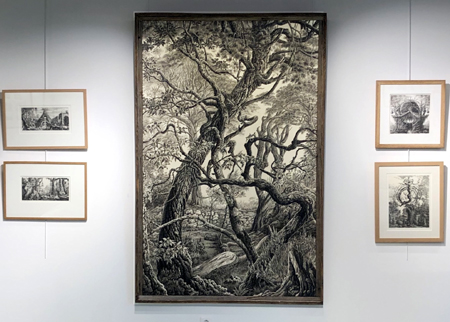 Les grands lavis côtoient les estampes sans que les unes et les autres en pâtissent même si elles sont parfois d’un format microscopique et si l’accrochage de la commissaire Véronique Dalle a su mettre le tout harmonieusement en valeur. Tous ces travaux sont construits d’un trait d’une finesse et d’une précision diaboliques qu’il faut regarder de très près. Leur grand intérêt est de montrer au-delà de l’art graphique de François Houtin, dont la notoriété n’est plus à faire, les qualités propres à chaque média exposé : comment le passage de la mine de plomb à l’eau-forte magnifie les noirs de premier plan et la légèreté des seconds plans, comment un rehaut de lavis donne à un tirage une autre valeur et une autre expression, comment une pointe sèche ouvre à un lavis sur un même sujet une porte supplémentaire vers le rêve, comment la maîtrise de tous ces médias donne une très grande homogénéité à son parcours artistique. À noter aussi dans les vitrines des dessins à l’encre de Chine, en leporello, ses récents « Carnets du confinement » où le végétal s’incarne en mille ornements, grotesques et autres chimères, préludes sans doute à d’autres pointes sèches ou eaux-fortes qui enrichiront nos méditations rêveuses vers lesquelles François Houtin sait avec son trait sûr nous mener.