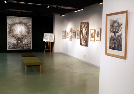 Ces deux teintes sont à l’honneur car François Houtin, sociétaire des « Peintres-graveurs », s’exprime exclusivement en noir et en blanc. Cette exposition exhaustive est accrochée dans le très bel et lumineux espace de ce centre culturel à Marcq-en-Barœul. Dessins à la mine de plomb ou à l’encre de Chine, pointes sèches, eaux-fortes et de très grands lavis composent cette présentation. Elle donne aux spectateurs attentifs et captivés un bon reflet du monde original de l’artiste. Ce monde imaginaire, et tout à la fois parfaitement réaliste dans sa vraisemblance, plonge le public dans un âge interglaciaire d’où toute faune aurait disparu. Ici nul cri ni turbulence animale mais le calme serein des végétaux qui poussent lentement leurs vrilles, leurs pousses, leurs feuilles ou leurs sarments à petit pas. Le fantastique végétal peuple ses œuvres d’une facture classique, figurative et souvent baroque.
