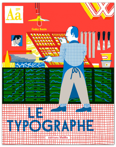 Gaby Bazin, Le typographe, Nantes, Éditions MeMo, 2022, (non paginé [36] p.), ill. en coul. ; 25 cm (18 €)