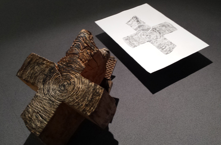 Plus complexe et énigmatique, l’installation scénarisée d’Éric Fourmestraux intitulée : « Chacun porte sa croix » narre des histoires de vie, la sienne et celles de personnes de son entourage. Issue de deux rencontres à vingt ans d’intervalle avec la carmélite Nathalie Poppins, l’histoire débute par un tee-shirt écarlate de marque Victorinox frappé sur son pectoral gauche d’une croix carrée blanche et néanmoins helvétique que portait l’artiste lors de la première rencontre. Ce vêtement avec sa croix carrée blanche sert de point commun à toutes les histoires exposées. Celles-ci se présentent sous la forme de vingt triptyques. À gauche le portrait à la pointe sèche de la personne portant à sa manière le tee-shirt écarlate initial, au milieu en lettres capitales embossées le mot clé de la croix portée : cancer, strabisme, etc. et, à droite, calligraphié au crayon, le témoignage de la personne sur la croix qu’elle porte. Ce parcours est accompagné de nombreux objets frappés par une croix carrée rouge, blanche ou verte : une vidéo avec les autres histoires non exposées, un brassard, une brassière, une plaque de jeu Lego, dans un coin un sac mortuaire, une enseigne de pharmacie, etc. Pour figurer le poids des maux ainsi retranscrits, une énorme croix carrée sculptée en bois repose sur un antique pèse-personne contemporain des conseils de révision d’antan. En fin de parcours, un tronc, posé sur le sol, invite chacun des visiteurs à y déposer son témoignage sur la croix qui est la sienne afin que puisse être poursuivie et enrichie cette œuvre en devenir.