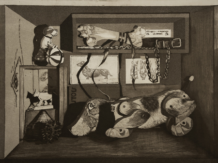 Un bel accrochage, qui aurait gagné, semble-t-il, à être généralement moins haut pour le regard, une gravure s’examinant aussi de près, et organisé avec un alignement précis des estampes, afin de bien équilibrer l’ensemble. La quantité d’œuvres allouées à chacun, et c’est le principal, permettant de bien apprécier chaque artiste. Par contre, pour en simplifier ma présentation, je vais me référer aux illustrations des fiches éditées pour chacun(e). Regrettant là encore que l’ensemble, séduisant en lui-même et bien imprimé, ne se réfère pas à une charte graphique définie.