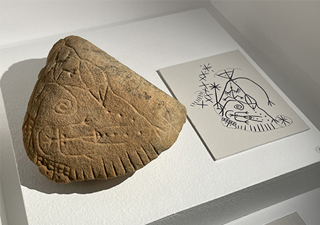 Car ce geste, ne serait-il pas, quelque part et sûrement, à la genèse du geste créateur qui s’épanouit, aujourd’hui et depuis plusieurs siècles, dans l’estampe gravée ? Cette idée, je l’ai adoptée, et j’aimerai vous la faire partager. D’autant que l’exposition dure jusqu’au 30 décembre 2023. Il y aurait en forêt, d’après Alain Bénard, ancien président du GERSAR (Groupe d’Études, de Recherches et de Sauvegarde de l’Art Rupestre), près de 2.500 abris ornés, dont la localisation n’est pas révélée pour les préserver de l’afflux du public et de dégradations possibles… Dans la plaquette de présentation rédigée par le Musée de Préhistoire, on peut lire : « Les gravures forment des compositions souvent denses, soigneusement réalisées, au sein desquelles se retrouvent les mêmes éléments de répertoire traités dans un style schématique très reconnaissable : signes géométriques variés, représentations humaines et animales, créatures surnaturelles ». Et d’offrir au regard des visiteurs, non pas des reproductions de ces graphes, mais des petits blocs gravés indépendants, trouvés, – et cela interroge -, dans des cavités de la roche, donc cachées au regard et difficilement accessibles. Une discrétion pour ce qui apparaît comme des représentations symboliques de signes, qui vont de l’abstraction à une figuration élémentaire, masculine ou féminine, parfois sexuelle, s’y ajoutant l’évocation stylisée d’un bestiaire environnemental. Une gravure marquant, semble-t-il, une relation entre une population primitive et les puissances surnaturelles…