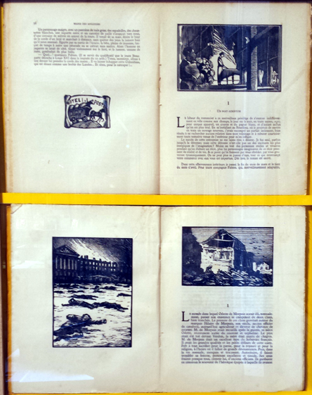 Dans le premier salon, une vitrine verticale rassemblait sur ses étagères en une parade impressionnante, aligné en ordre tout de jaune vêtu, l’ensemble des 235 titres de la collection. D’autres vitrines horizontales étaient dévolues soit aux auteures féminines du « Livre de demain », dont Colette, soit aux techniques et aux outils de la gravure sur bois debout, soit à d’autres ouvrages illustrés par certains xylographes de la collection, soit aux techniques d’impression de ces livres et à celles de reproduction des xylographies originales. Naïvement j’avais toujours pensé que celles-ci avaient été directement imprimées sur ces ouvrages. Mais il n’en a pas été ainsi. Seuls quelques exemplaires de tête étaient imprimés directement à partir des planches sur du papier de Chine. Tous les autres exemplaires suivants, au vu de la grande quantité commandée et de leur ré-édition possible, ont été imprimés avec des clichés-zinc au trait obtenus à partir des planches originales2.