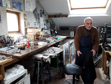 L’artiste a installé son atelier au deuxième étage, sous les toits. La seconde volée d’escaliers, peinte en blanc, est un peu plus raide et étroite que la première. Le mur en est couvert d’estampes encadrées, et il y en a plein d’autres sur le palier éclairé par un Velux®, ainsi que dans des étagères et dans des X, à côté d’un évier où, lorsque l’occasion se présente, Guy Jahan fait mordre ses eaux-fortes.