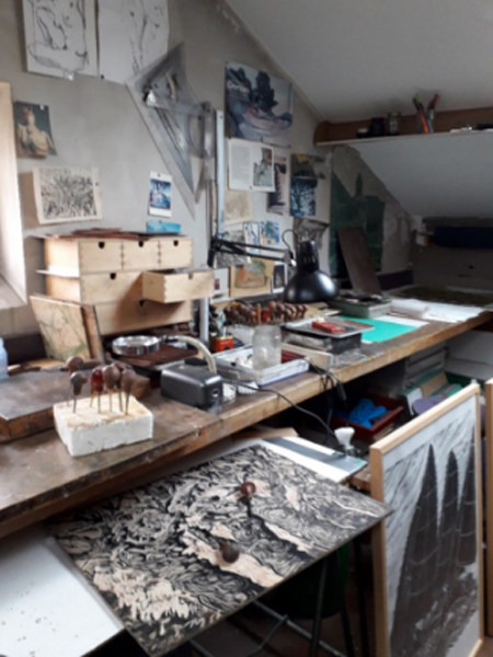 Sur toute la longueur Guy Jahan a monté un grand établi, formé d’une immense planche aujourd’hui presqu’entièrement dissimulée sous un bric-à-brac spécial graveur. Sur la gauche, une table de chauffe devant laquelle sont suspendus ou posés des rouleaux, des boîtes d’encre, des bouteilles de divers produits toxiques en verre ou en plastique. Il y a partout de vieilles boîtes à gâteaux contenant des crayons, des feutres et des stylos de toutes sortes, des opinels®, des cutters, des pinceaux, et plein d’outils pour la plupart plantés dans des blocs de polystyrène : burins, échoppes et onglettes pour graver le bois. Comme beaucoup de graveurs, il a la passion des outils – je pense au regretté François Maréchal, qui en avait une fabuleuse collection – et il n’en utilise guère que trois ou quatre, toujours les mêmes.