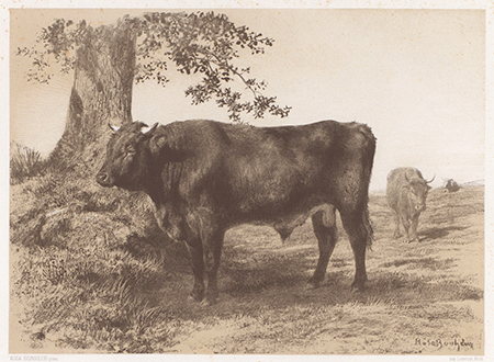 « Étude de taureau » [n° catalogue 1856] – lithographie (20,7 x 28 cm) – Rosa Bonheur (1858) Imprimé par Joseph Rose Lemercier – Édité par Hippolyte Peyrol Rijksmuseum (Amsterdam, Pays-Bas)