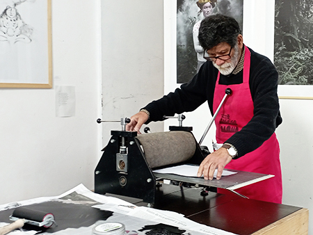 Américo Caamaño Quijada entraîné à manipuler une presse professionnelle travaille avec minutie et précision, il en résulte une impression qui exergue la force de l’encre noire déposée sur le papier blanc humide. Rares sont ses gravures en couleur, celles qui le sont – au bleu profond et vert de jade – renvoient ce même effet de puissance.