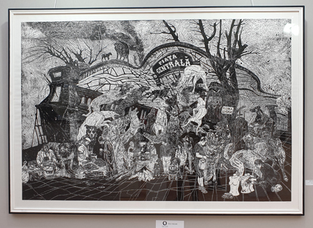En cette dernière quinzaine de février 2025 la métropole parisienne offrait abondamment à ceux qui se passionnent pour l’art de l’estampe l’occasion de rassasier leurs regards. Qu’on en juge : « Art Capital » au Grand-Palais, Damien Deroubaix à la BnF, « Illusions (conjugales)… » à la Maison Balzac, « Figures » à la galerie Anaphora, Gilles Martin-Lecointe à la Fondation Taylor, « Traits d’union de la JGC » à la mairie du VIe, etc. Devant cet abondance, le choix était embarrassant. Aller admirer la verrière du Grand-Palais rénové et son architecture de fer repeinte en vert céladon sur l’ocre lumineux de ses murs était bien tentant. Une visite sur la rive droite de la Seine peut-être suivie d’une autre sur sur sa rive gauche s’imposaient ce jour-là. D’autant plus que l’évènement ne durait que quatre jours. Fendu la foule de la place Georges Clemenceau, franchi l’embrouillamini des barrières métalliques, des barnums et des longues files d’attente des deux autres expositions de prestige et passé le porche, sous la lumière de la verrière une multitude de stands dévoilait toute l’importance de cette manifestation où deux mille artistes accrochaient leurs travaux.