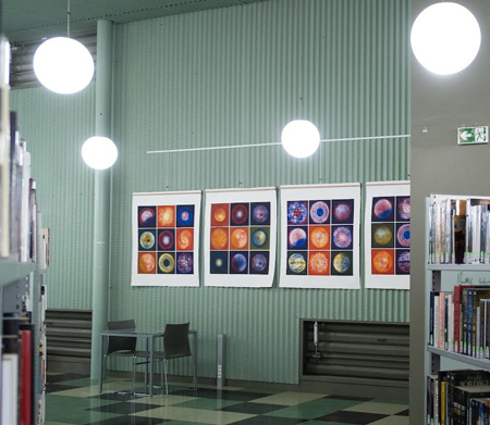 Clémence Fernando présente « Cent 1000 milliards de planètes » à la médiathèque Romain Rolland de Romainville. Le titre de l’exposition fait un clin d’œil au livre « Cent mille milliards de poèmes » de Raymond Queneau. Le poète et l’artiste graveuse mettent à l’œuvre la même démarche combinatoire : là où Queneau combine des vers pour générer des sonnets, Fernando combine des estampes pour générer des œuvres de grand format.