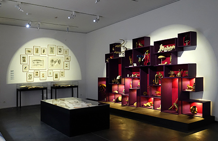 Et la visite se poursuit par des reconstitutions, comme celle du cabinet de travail d’un naturaliste de la fin du 18e – début 19e siècle, avec des naturalisations animalières et nombre d’illustrations gravées, tirées d’ouvrages historiques et, derrière une belle maquette de voilier trois-mâts, une grande reproduction d’une « Mappe Monde » de 1816 indiquant les tracés des voyages des grands explorateurs.