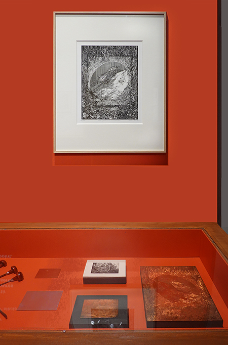 Le parcours nous conduit dans un petit espace très sobre mais aux couleurs chaudes, oranges et rouges, dédié, pour le profane, à l’estampe d’aujourd’hui et où figurent les trois principales composantes de l’estampe. Elles sont présentées, pour les deux premières, sur des panneaux didactiques et des vitrines montrant l’outillage requis, des exemples de planche et tirage : ainsi pour la xylographie et la chalcographie, cette dernière étant illustrée par le cuivre et l’épreuve d’une gravure intitulée « Écran végétal pour une chanteuse », l’un des plus beaux burins du grand François Verdier (1945-2014), artiste et professeur de gravure à Niort.