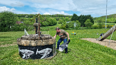 Les murs se sont transformés en musée pour la fête de l’estampe : des abeilles sont apparues sur le silo à grain, sur les murs de la bibliothèque et sur les portes du couple d’apiculteurs du village. Des baleines nagent sur le puits au milieu du parc et sur les murs de l’école. Des oiseaux volent et observent leurs proies sur les murs du salon de coiffure, de la boulangerie et dans la rue des Dames.