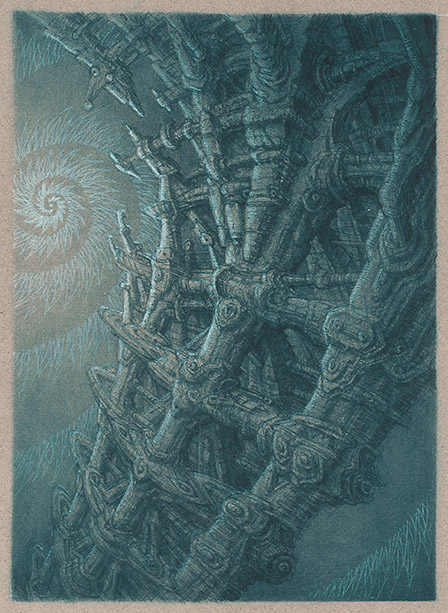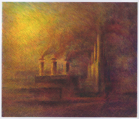 « L’usine à gaz » Pointe sèche et tireté sec en trichromie sur rhénalon (2019) 23,4 x 27,4 cm (Cl. Catalogue)