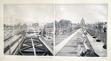 La seconde est le diptyque de Nicolas Sochos « Sur le pont des Arts », vues parisiennes traditionnelles et pourtant : à gauche vu du quai Conti, le pont des Arts écorché d’où sourdent ses entrailles métalliques et au bout la cour carrée du Louvre où reposent d’immortels chef-d’œuvres ; à droite vu de l’autre rive, le pont toujours en travaux et l’Institut où siègent des Immortels dont les noms et les œuvres seront souvent oubliés quelques décennies plus tard ; parabole visuel sans doute de la difficile postérité de tous les ouvrages se réclamant de l’art.