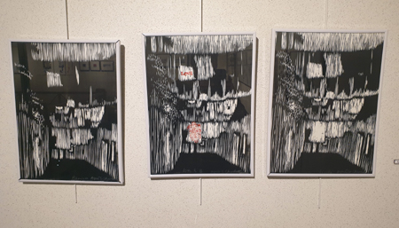 Les deux premières conçues par des habitués de longue date de cette manifestation, la troisième par une plus modeste sociétaire. « Traits d’union » d’Agnès Gauthier-Chartrette est la première surprise. Elle abandonne ici le tricot de ses tailles-douces pour la gouge du xylographe. Dans sa puissante gravure en noir et blanc à peine rehaussée d’un rouge au tampon, se retrouve un de ses sujets récurrents : entre les deux murailles d’une ruelle ou d’une rue que relient des fils suspendus, pendent des linges qu’on distingue à peine vus de près et qui prennent le vent quand on s’en éloigne.